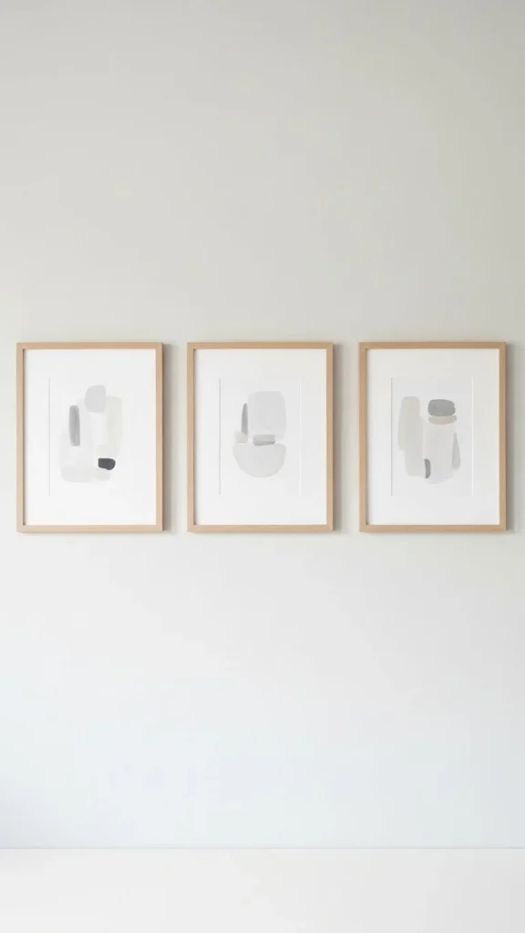 Choose simple art with soft lines or muted colors. One or two pieces are enough. Light wood or thin frames keep the look gentle.