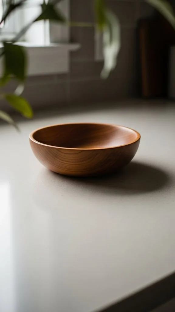 Wooden bowls add shape without heaviness. Leave them empty or add fruit. Older bowls with wear feel softer than new ones.