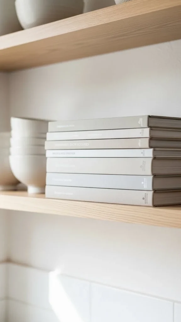 Cookbooks in beige or muted covers blend smoothly. Stack two or three. Top with a small object for balance.