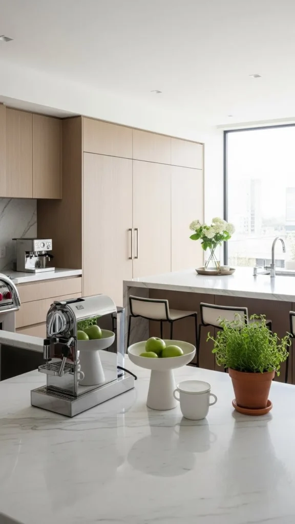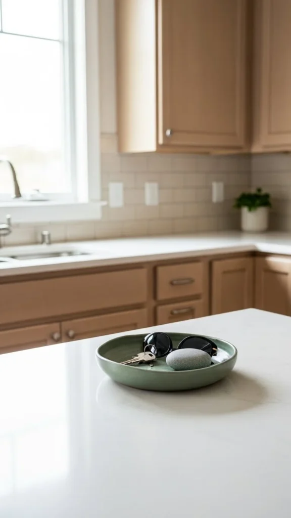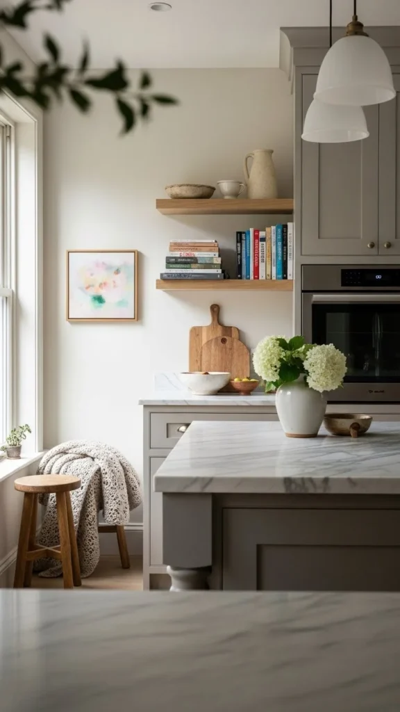 A handwritten note, a favorite mug, or a photo adds warmth. Keep it minimal. Personal items make the kitchen feel lived-in while staying soft.
