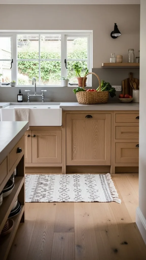 Neutral rugs add comfort and texture. Choose low-pile styles in beige, taupe, or faded patterns. Place them where you stand most. Slight wear adds character and helps the space feel relaxed rather than styled.