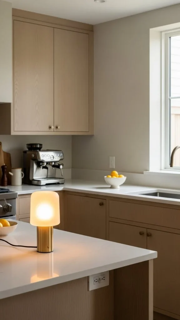 Lamps bring softness at night. Choose a small base and fabric shade. Place it on a counter or shelf away from water. Warm bulbs help neutral kitchens feel cozy instead of stark.