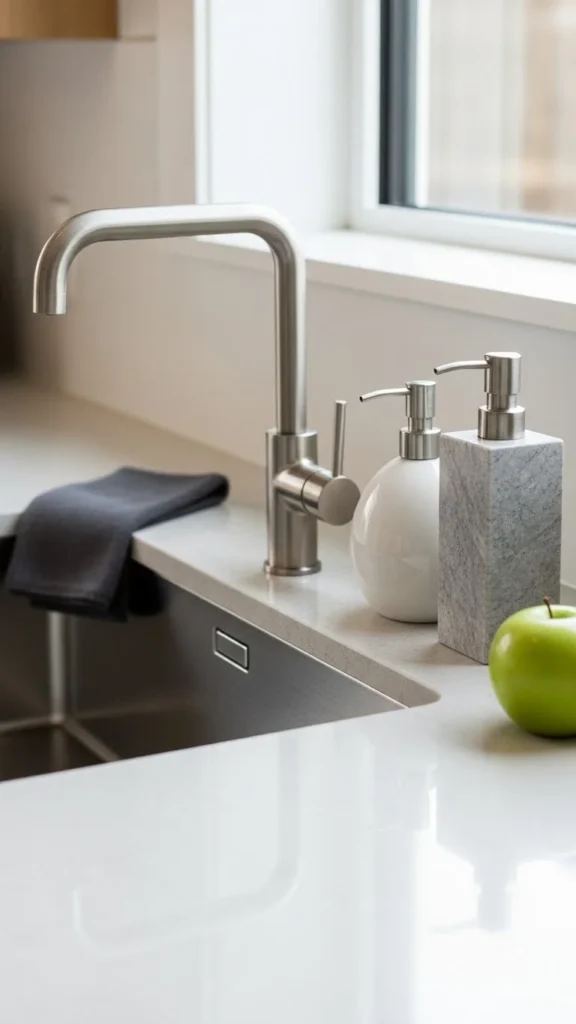 Replace plastic bottles with stone or ceramic pieces. Soft matte finishes work best. Keep colors muted. This small detail calms the sink area and adds a natural feel.