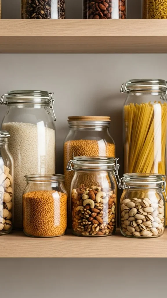 Glass jars keep storage light and airy. Reuse jars you already own. Remove labels and line them up neatly. This keeps shelves looking soft instead of busy.