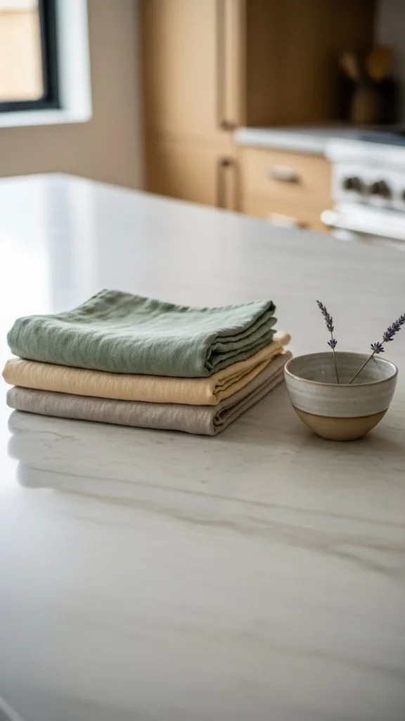 Linen towels feel relaxed and natural. Stick to creams, light grays, or muted stripes. Fold or hang them evenly. Multipacks help keep costs low.