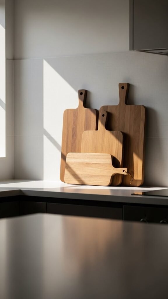 Wood adds instant softness to neutral kitchens. Lean cutting boards or small wooden trays against the backsplash. Lighter woods feel airy while medium tones add warmth. Thrifted boards work well and don’t need to match perfectly. Even one wood piece can balance stone or tile surfaces.