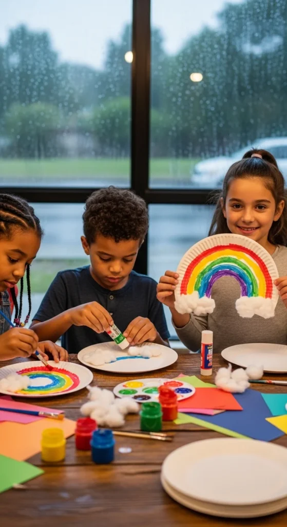 Paper plate rainbows are one of the easiest rainy day crafts because they use simple supplies and give kids a colorful result fast. Start with a plain paper plate cut in half, then paint or color rainbow stripes across the curved side. Add cotton balls at both ends for clouds, and let kids decide whether they want bold classic colors or softer pastel tones. This project works well for different ages because younger kids can focus on coloring while older children can add extra details like hanging raindrops, glitter glue, or tiny drawn weather faces. It is also budget-friendly since paper plates, crayons, markers, and cotton balls are common household supplies. If paint feels too messy for an indoor afternoon, switch to torn paper collage strips instead. That keeps the same rainbow effect with less cleanup. Once dry, the rainbows can be taped to a window, hung on a wall, or added to a rainy day craft display. It is cheerful, low-stress, and perfect for brightening up a gray afternoon indoors.