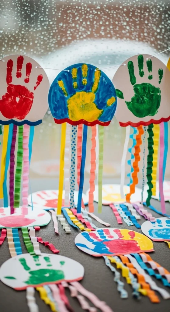 Handprint jellyfish are a wonderful craft because they feel personal and a little magical. Paint or trace a child’s handprint upside down to create the jellyfish body, then add dangling tentacles made from ribbon, yarn, tissue strips, or paper curls underneath. Kids can decorate the top with dots, glitter glue, or little drawn eyes if they want a cartoon look. This project works well for rainy days because it gives children a sensory painting experience and a finished sea creature in one activity. It is also easy to adjust by age. Younger children can focus on the handprint and tentacles, while older ones can build a full ocean background with fish, waves, and bubbles. A budget-friendly tip is to use scrap wrapping ribbon, torn gift tissue, or cut grocery bag strips for the tentacles. The craft is simple enough to make more than one, which often leads kids into building a whole underwater scene. That makes it a strong screen-free option for a longer indoor afternoon.