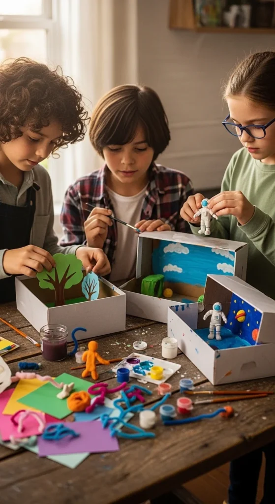 Shoebox dioramas are perfect for kids who enjoy building small worlds. Start with an empty shoebox or small cardboard box and choose a theme such as a jungle, bedroom, farm, castle, underwater scene, or dinosaur land. Kids can paint the background, cut paper shapes, and glue in handmade trees, animals, furniture, or people. This craft works so well on rainy days because it keeps children busy for a longer stretch and allows them to return to the project later if needed. A low-cost tip is to use recycled paper, cereal boxes, bottle caps, and scraps from old packaging instead of buying miniature craft pieces. Shoebox scenes also invite storytelling once they are done, which gives them even more play value. Younger children can keep the setup simple with one background and a few large pieces, while older kids may enjoy layering details and making movable parts. This craft feels bigger than a quick paper activity, so it is especially useful when the afternoon feels long and kids want something that lets them build, imagine, and keep adjusting their design.
