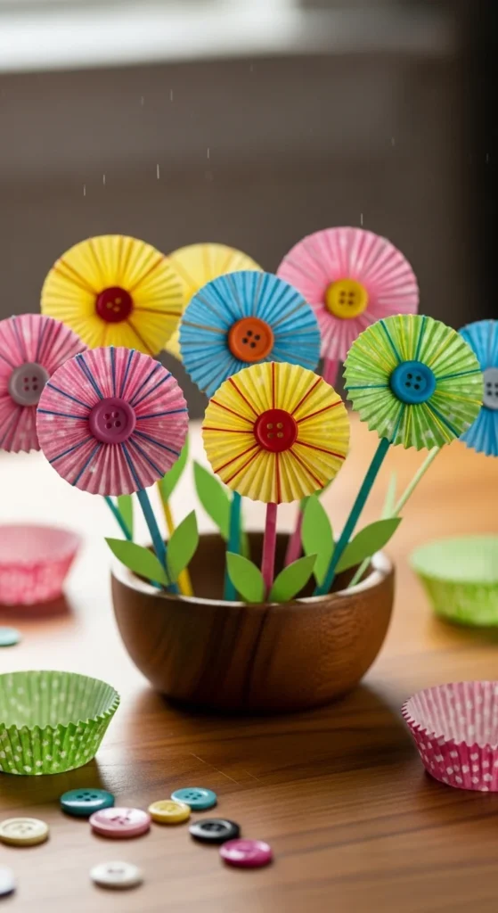 Cupcake liner flowers are a cheerful rainy day craft that turns baking supplies into colorful art. Flatten or fold cupcake liners, layer them like petals, and glue them onto paper stems or cardboard backgrounds. Add a button, pom-pom, or drawn circle in the center to finish each flower. Kids can make single flowers, bouquets, or a whole garden collage depending on their mood. This project works well because the shapes already feel decorative before any cutting starts, which makes the craft easier for younger children. A low-cost tip is to use plain liners colored with markers if bright patterned ones are not available. You can also combine them with tissue paper leaves or scrap paper vases. Cupcake liner flowers are especially nice for rainy afternoons because they brighten up the room and feel seasonless. Kids can give the finished flowers as cards, hang them on the wall, or use them in pretend flower shops. The process is simple, but the result looks full and pretty, which makes this craft feel more rewarding than its supply list suggests.