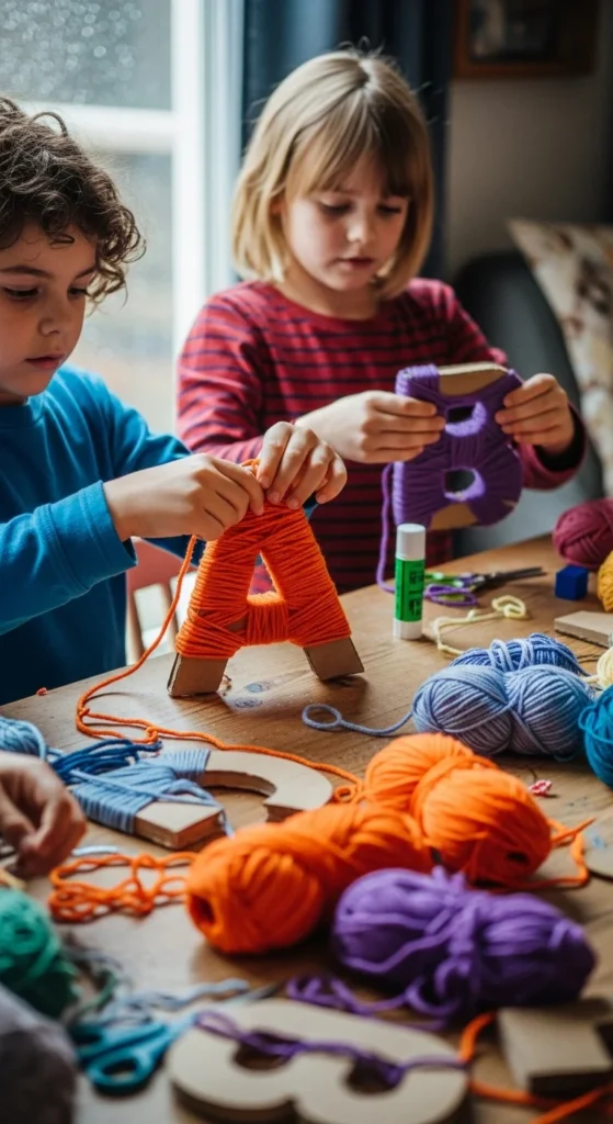 Yarn wrapped letters are a nice craft when kids want something slightly more focused and decorative. Cut large letter shapes from cardboard using initials, favorite words, or simple shapes like hearts and stars if letters feel too tricky. Then let children wrap yarn around the cardboard until most of the surface is covered. This craft is especially good for building patience and hand control, but it still stays simple enough for a quiet rainy afternoon. A low-cost tip is to use leftover yarn bits from old projects or even strips of fabric cut from worn T-shirts. If wrapping the whole shape feels too hard for younger kids, use shorter pieces of yarn and tape the ends on the back. Once finished, the letters can hang on a bedroom door, sit on a desk, or become part of another collage. This project works well because it feels tactile and calming. It is also useful for siblings since each child can make a different letter or shape with the same small pile of supplies.