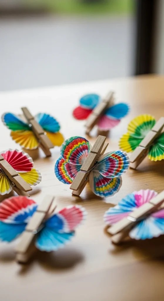 Coffee filter butterflies are light, colorful, and easy enough to make with very little setup. Let kids color coffee filters with washable markers, then lightly mist them with water so the shades spread and mix. Once dry, pinch the filter in the middle and clip it with a clothespin or tie it with pipe cleaner to form the butterfly body. Add antennae and tiny eyes if you want more detail. This craft is especially good for rainy days because the color mixing feels almost magical and keeps children engaged without needing a lot of materials. A budget-friendly tip is to use paper towels or thin white napkins if coffee filters are not in the kitchen. The finished butterflies can be taped to windows, hung from string, or added to a paper garden. Older kids can experiment with layered wings and patterns, while younger children usually enjoy the spreading colors most of all. It is a bright and satisfying craft that turns simple household supplies into something delicate and decorative.