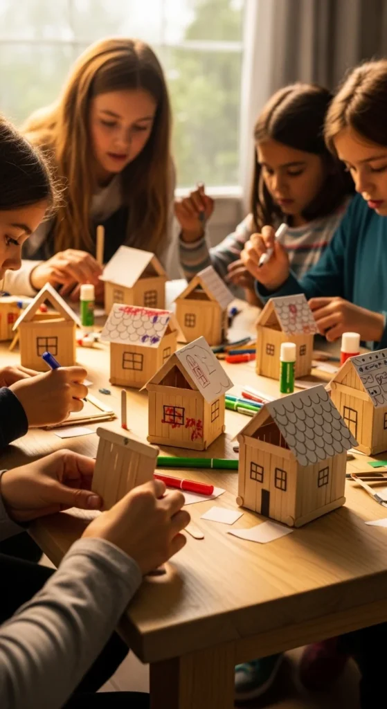 Popsicle stick houses are a good choice for kids who like building rather than only painting or coloring. Glue craft sticks side by side for walls, then add a triangle roof shape from paper or cardboard. Kids can decorate the house with doors, windows, flowers, chimneys, and tiny signs if they want extra detail. This project works well on rainy days because it feels like construction and art mixed together. Children can keep it simple with a flat house picture or build a more three-dimensional version if they are older and patient. A budget-friendly tip is to use cardboard strips or cut paper sticks if wooden craft sticks are not available. You can also turn leftover packaging into roofs and shutters. Once finished, the houses can become part of a cardboard town, fairy village, or a shoebox scene from another craft. This project is especially useful when kids want something that takes a bit more focus and results in a finished object they can keep, display, or build on later.