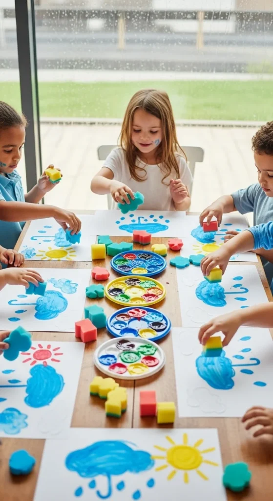 Sponge stamping is an easy way to make weather art that fits the mood of a rainy day. Cut sponges into simple shapes like clouds, suns, raindrops, umbrellas, or lightning bolts, then let kids dip them into washable paint and stamp them onto paper. This works well because the process feels active and repetitive without being hard. Kids can build whole weather scenes, pattern pages, or simple posters filled with stormy or sunny shapes. If you do not want to cut special sponge shapes, regular kitchen sponge pieces work fine for stamping clouds and backgrounds. A budget-friendly tip is to use old food tray lids or plates as paint trays so cleanup stays manageable. This craft is especially good for younger children because they get clear shapes quickly and do not need much drawing skill. Older kids can layer markers or crayons on top once the paint dries. It is a cheerful indoor project that turns the rainy view outside into an art theme rather than something to complain about.
