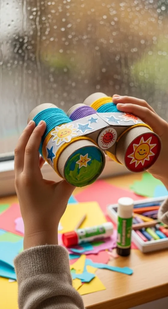Cardboard tube binoculars are a smart rainy day craft because they turn recycled supplies into something kids can keep using for pretend play. Tape or glue two empty cardboard tubes side by side, then let children decorate them with paint, stickers, washi tape, or crayons. Punch a hole on each outer side and tie on a yarn strap so the binoculars can hang around the neck. Once finished, kids can use them for indoor animal safaris, window bird watching, or pretend camping in the living room. This is especially helpful on rainy afternoons because the craft naturally leads into another activity instead of ending the moment the glue dries. A low-cost tip is to use leftover wrapping paper, newspaper pieces, or scrap fabric strips for decorating instead of opening a new craft set. If you want to add a learning twist, ask kids to “spot” colors, shapes, or objects around the room using their new binoculars. This project is easy, creative, and a good way to turn recycling into play without making the setup complicated.