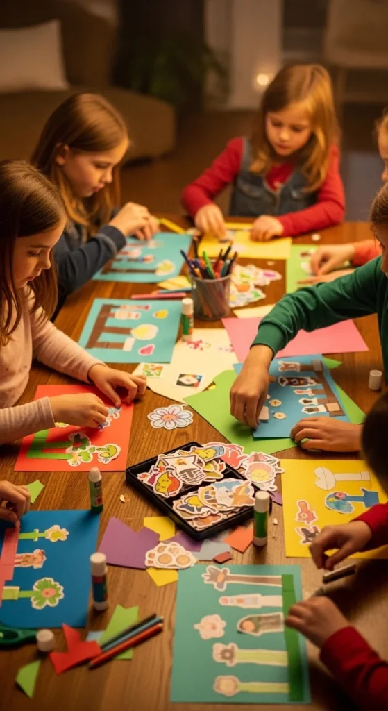 Homemade sticker scenes are a smart rainy day craft because they stretch into both making and play. Kids can draw simple shapes, animals, foods, or characters on sticker paper if you have it, or on regular paper with double-sided tape rolled behind each piece. Then they can place the “stickers” onto a bigger background scene such as a park, bedroom, ocean, or city. The fun part is that the pieces can be moved around if you use tape or reusable adhesive. This makes the craft feel more like a game board than a one-time art sheet. A low-cost tip is to use address labels, leftover packaging stickers, or even plain paper with homemade tape loops. Younger children can enjoy creating simple houses and animals, while older ones may build whole storytelling boards with many moving parts. This project is useful on rainy days because it keeps children busy through several stages: drawing, cutting, arranging, and then playing. It is creative, flexible, and easy to personalize with whatever themes kids already love.
