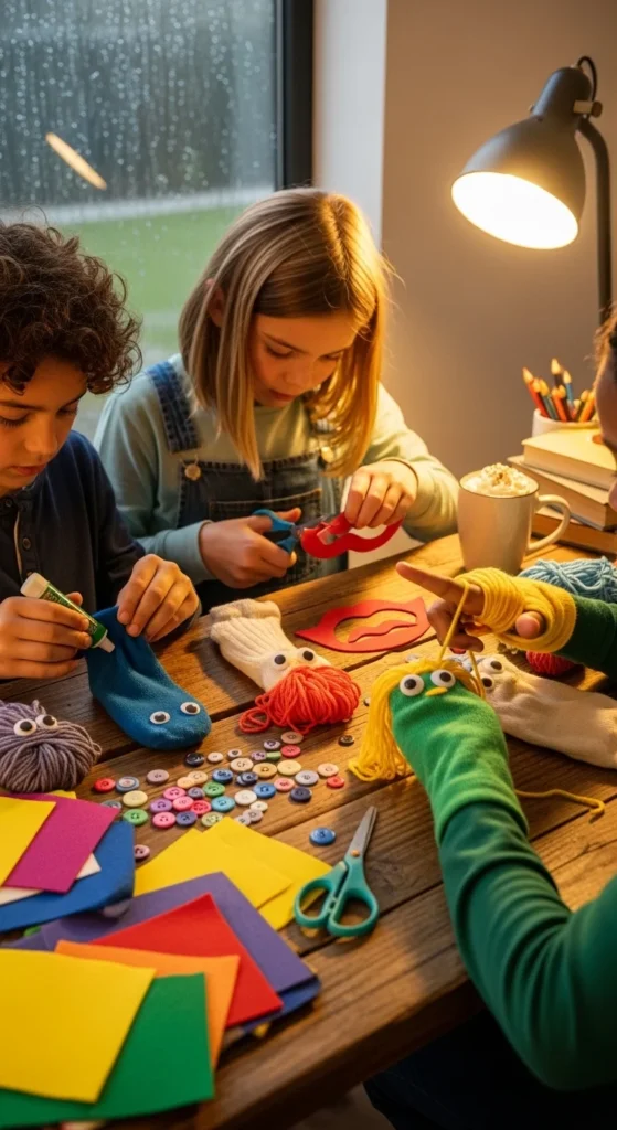 Rainy day crafts work best when they are simple to start, fun to finish, and open enough for kids to make them their own. With paper, cardboard tubes, buttons, yarn, cotton balls, paint, pasta, socks, and recycled boxes, you can turn a long indoor afternoon into a mix of building, painting, cutting, stamping, wrapping, pretending, and storytelling. The real magic is that many of these projects keep going after the craft itself is done. Puppets become shows, maps become treasure hunts, story stones become games, and binoculars become pretend adventures by the window. Pick one or two ideas, gather what you already have at home, and let the rainy day turn into something creative instead of restless.