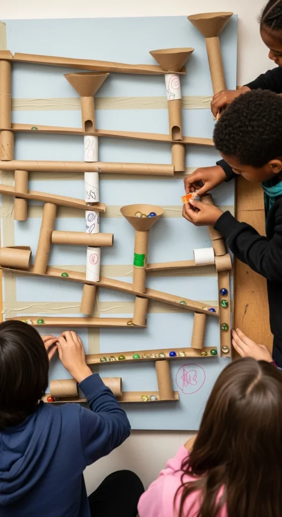 Paper roll marble runs are perfect when kids want a craft that doubles as an experiment. Use cardboard tubes cut in half lengthwise, then tape them at angles onto a wall, cardboard board, or large box so marbles, pom-poms, or small balls can roll down the path. Children can test different slopes, turns, and heights to see what works best. This craft is especially good for rainy days because it combines building, testing, and adjusting, which keeps kids engaged longer than a flat paper project might. A low-cost tip is to save toilet paper tubes, paper towel rolls, and cereal boxes ahead of time so you have enough parts for a longer run. If marbles are not a good fit, use cotton balls or pom-poms for a safer version with younger kids. Once the first run is built, children almost always want to change it and improve it, which is part of the fun. It feels like play, but it also encourages problem-solving and planning in a very natural way.