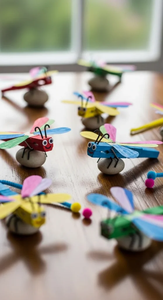 Clothespin dragonflies are quick, colorful, and easy to make with very basic supplies. Start with a clothespin as the body, then add wings made from tissue paper, cupcake liners, or cut paper shapes. Kids can paint or color the clothespin first, then glue or clip the wings in place and add googly eyes if they want a playful finish. This craft works well because it can be finished fairly quickly, which is helpful when children want a success fast before moving on to play. A budget-friendly tip is to use recycled wrapping tissue, old magazine pages, or leftover gift paper for the wings. If clothespins are not available, cardboard strips folded into body shapes can work too. Once finished, the dragonflies can hang on a string, sit in a paper garden, or clip onto curtains and shelves for decoration. This is a good rainy day craft because it feels light and cheerful, and it is easy to make several in different colors without turning the table into a huge mess.