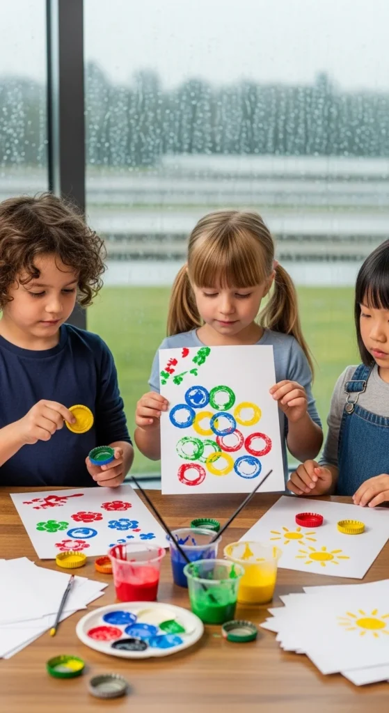 Bottle cap stamping is a brilliant craft when you want something simple, repetitive, and satisfying. Dip clean bottle caps into washable paint and stamp them onto paper to create flowers, balloons, caterpillars, bubble patterns, wheels, or abstract art. Different cap sizes add more variety without requiring extra tools. This project is especially useful for rainy afternoons because it is easy to set up, easy to repeat, and easy to adapt for different ages. Younger children can enjoy random colorful stamping, while older kids can plan pictures made from repeated circles. A budget-friendly tip is to save caps from water bottles, milk jugs, or juice cartons instead of buying special stamp tools. If you want to keep the mess more controlled, pour paint onto sponges in shallow trays rather than dipping directly into puddles of paint. Bottle cap art is a strong screen-free option because it gives fast visual results and encourages experimentation. It also pairs nicely with weather themes, flower gardens, and outer space scenes made from simple circle shapes.