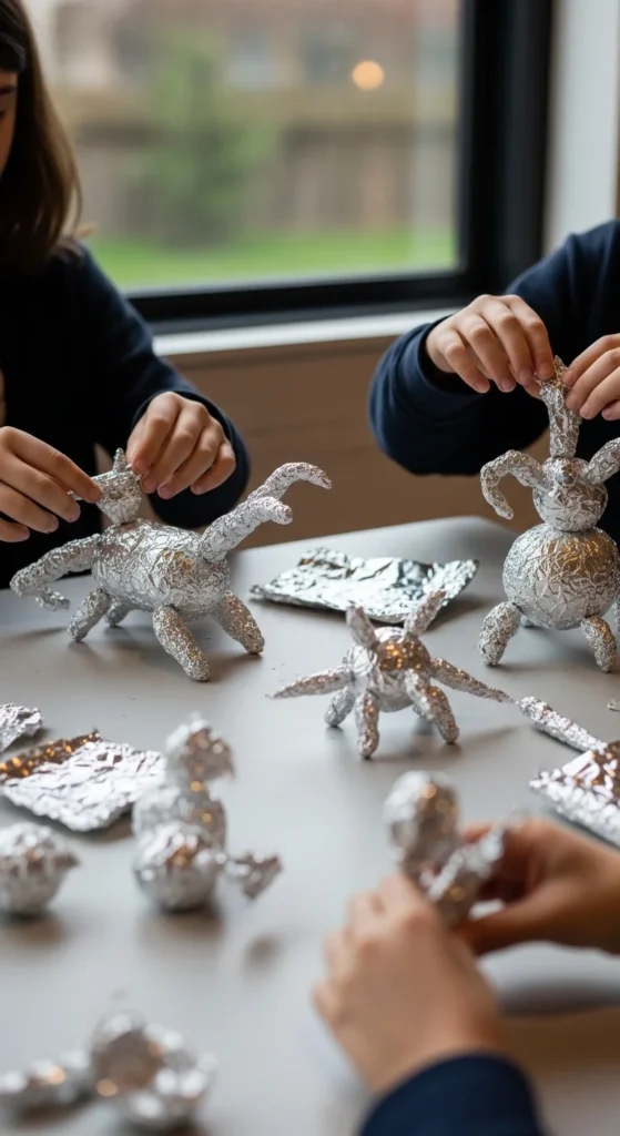 Tin foil sculptures are one of the easiest no-fuss crafts for a rainy day because the material is already flexible and fun to shape. Give kids sheets or strips of foil and encourage them to make animals, rockets, crowns, swords, tiny people, or abstract towers. The foil can be scrunched, rolled, flattened, pinched, and twisted without needing glue or drying time. That makes it especially helpful when children want a project with instant results. A budget-friendly tip is to use leftover clean foil from the kitchen or save larger pieces for bigger builds. If you want more structure, wrap foil around cardboard shapes or paper balls. Older kids may enjoy making a sculpture challenge, such as “make a zoo animal” or “build the tallest tower,” while younger children often love the sensory part of shaping the metal itself. This craft is simple, open-ended, and surprisingly engaging. It keeps hands busy and can shift quickly from pure making into pretend play, which makes it a strong choice when everyone is stuck indoors and energy is building.