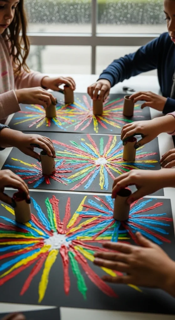 Cardboard tube fireworks are a fun painting craft that gives kids a big visual payoff with very little effort. Cut the ends of a cardboard tube into thin fringe strips, spread them outward, dip them into paint, and stamp them onto dark paper to create firework bursts. Kids can layer several colors, overlap stamps, and add marker stars or spark lines once the paint dries. This project works beautifully on rainy days because it feels active and energetic without needing outdoor space. It is also budget-friendly since the main tool is a recycled tube. If you want more variety, use different tube widths or snip some fringe longer and some shorter for different burst shapes. A sponge or old cloth nearby makes cleanup easier between colors. This craft is especially good when children want to paint but you need something with a clear, repeatable method. The results look bold and impressive, which helps keep interest high. It is an easy way to turn a dull afternoon into something colorful and exciting.