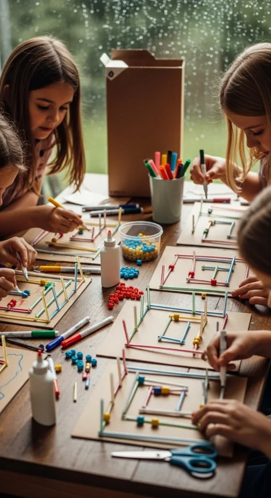 Cereal box mazes are a great rainy day project because they combine drawing, building, and problem-solving. Cut the front off a cereal box or use the back panel as a flat base, then draw a maze path or glue paper strips, straws, or cardboard walls to create one. Kids can use a bead, marble, or button as the moving piece and try to guide it from start to finish. This craft is especially strong for older children who enjoy making something interactive. A low-cost tip is to save packaging materials ahead of time so there are plenty of pieces for walls and dividers. If you want a simpler version for younger kids, draw the maze with thick markers and let them guide a toy figure or sticker through it. More advanced kids can make themed mazes such as treasure maps, animal rescue paths, or space routes. This project works well indoors because it takes time, feels purposeful, and gives children something to test and replay after the making stage is over.