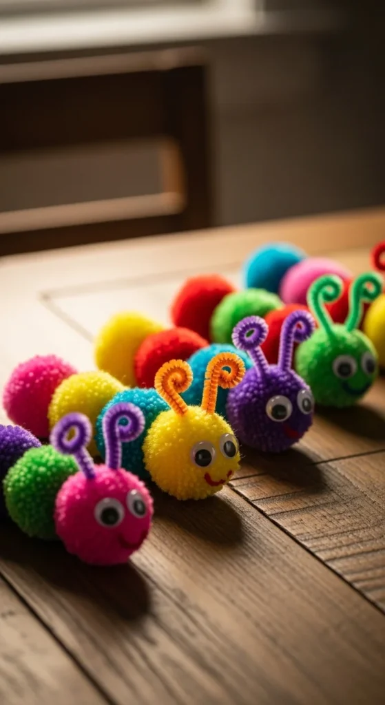 Pom-pom caterpillars are perfect when kids want something cute and tactile that comes together quickly. Line up pom-poms in different colors or in one matching shade, glue them onto a strip of paper or cardboard, and add googly eyes plus tiny pipe cleaner antennae. The result is cheerful, soft, and fun to hold. This craft works well for younger children because it focuses on arranging and gluing rather than tricky cutting. Older kids can make a whole family of caterpillars, name them, or build tiny paper leaves for them to “crawl” on. A budget-friendly version uses cotton balls colored with markers or tissue paper instead of store-bought pom-poms. You can also cut circles from felt or paper if that is what you have. Once done, the caterpillars can become part of a homemade story, puppet show, or nature-themed display on a shelf. This is a strong rainy day option because it is low-mess, quick to finish, and easy to repeat if kids want to keep going with butterflies, bugs, or garden scenes afterward.