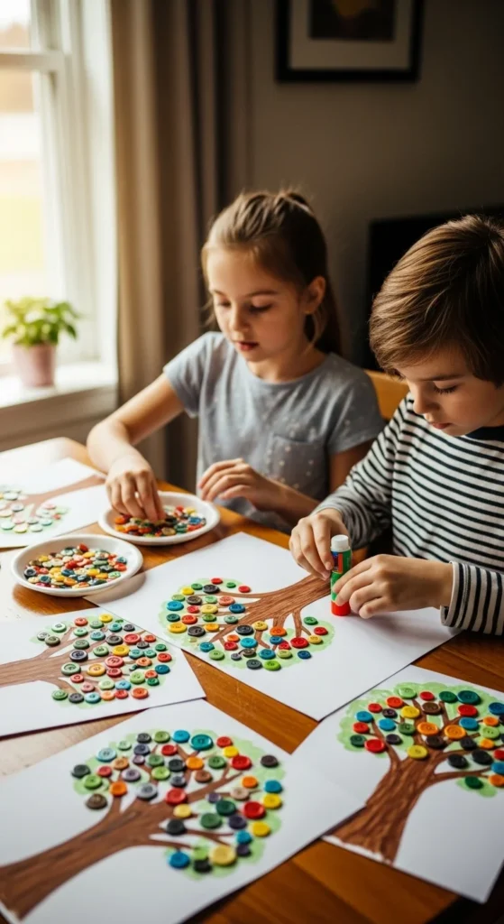 Button tree art is a lovely indoor craft because it mixes painting, sorting, and gluing in one simple project. Start by drawing or painting a tree trunk with branches on cardstock or cardboard. Then let kids glue buttons onto the branches like blossoms, leaves, or fruit. This gives the artwork texture and color without requiring advanced drawing skills. The project is especially good for rainy days because it feels calm and focused, making it a nice choice when the house is noisy or everyone needs to settle down a bit. If you do not have a button jar, cut circles from scrap paper or use beans, sequins, or tiny pompoms instead. A fun variation is to make seasonal trees, such as green for spring, bright mixed shades for summer, orange and brown for autumn, or white button “snow” for winter. This craft also works well for siblings because each child can build a completely different tree from the same basic idea. The final artwork looks polished, but the process stays easy and very affordable.