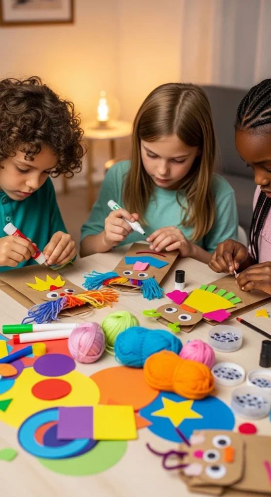 Paper bag puppets are a rainy day favorite because they turn simple supplies into characters kids can use right away. Start with a brown paper lunch bag, then decorate the flap area as the puppet’s mouth or face. Add paper ears, yarn hair, marker details, googly eyes, or little fabric scraps for clothes. Kids can make animals, monsters, princesses, superheroes, or silly made-up creatures. This craft is great because it naturally becomes pretend play once the decorating is done. That means the fun lasts much longer than the making stage. A helpful budget tip is to use magazines, junk mail, scrap paper, and leftover gift wrap for the features instead of using new packs of cardstock. If younger children are involved, pre-cut a few basic shapes so they can focus on gluing and arranging. Older kids can make a full puppet cast and put on a living room show. This project works well for rainy afternoons because it feels open-ended, creative, and full of personality without needing much more than paper, glue, and imagination.