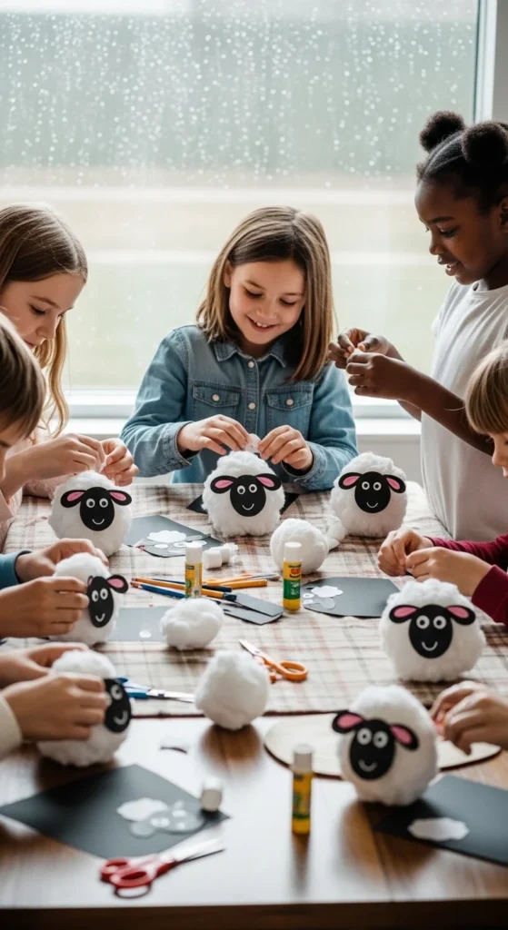 Cotton ball sheep are a simple craft that feels soft, playful, and perfect for younger kids. Draw or print a sheep body shape, glue it onto paper or cardboard, and then cover the body with cotton balls for a fluffy texture. Add a black paper face, legs, and ears to finish the look. This project is helpful on rainy days because it is easy to set up and does not require many supplies. Kids enjoy the texture of the cotton and the satisfaction of watching the sheep fill out as they glue each piece down. If cotton balls are not available, use torn tissue paper, white pom-poms, or bits of recycled packaging material instead. A fun extra step is to make a whole farm scene with paper grass, clouds, and a little barn in the background. This gives the craft more life and keeps kids busy longer. Cotton ball sheep are especially good for preschool and early elementary ages because the steps are simple, clear, and forgiving. Even imperfect shapes still come out adorable.