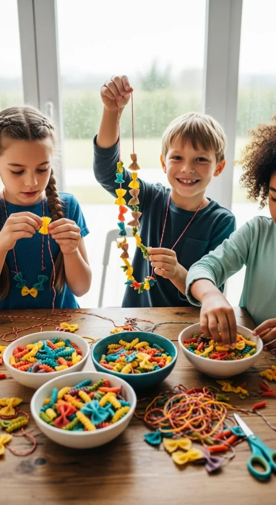 Pasta necklaces are a classic for a reason. They are affordable, colorful, and easy enough for a wide range of ages. Dye dry pasta ahead of time with food coloring and a small splash of vinegar, or use plain pasta and let kids paint it first if you want to extend the activity. Once dry, string the pieces onto yarn or shoelaces to make necklaces, bracelets, or hanging decorations. This craft is especially useful on rainy days because it combines sorting, pattern-making, and hand control in one simple setup. Younger children can enjoy random color mixing, while older kids can plan striped patterns or themed color sets. A low-cost tip is to use whatever pasta shapes are already in the pantry instead of buying special types. Tube pasta is easiest for little hands to thread. If you want to add another layer of fun, turn the finished necklaces into “pretend treasure” for dress-up games. This project keeps hands busy, uses very basic materials, and creates something kids are usually proud to wear or gift afterward.