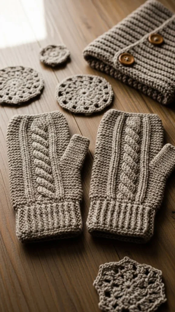 Fingerless gloves keep your hands warm while leaving your fingers free for daily tasks. Use medium-weight yarn so they stay flexible. The simplest pattern is a rectangle sewn up the side with a hole left for the thumb. Add ribbed cuffs if you want a more polished edge. These gloves work well for typing, crafting, or chilly walks.