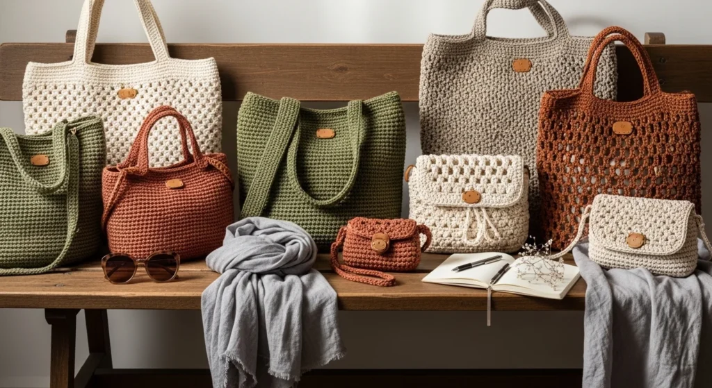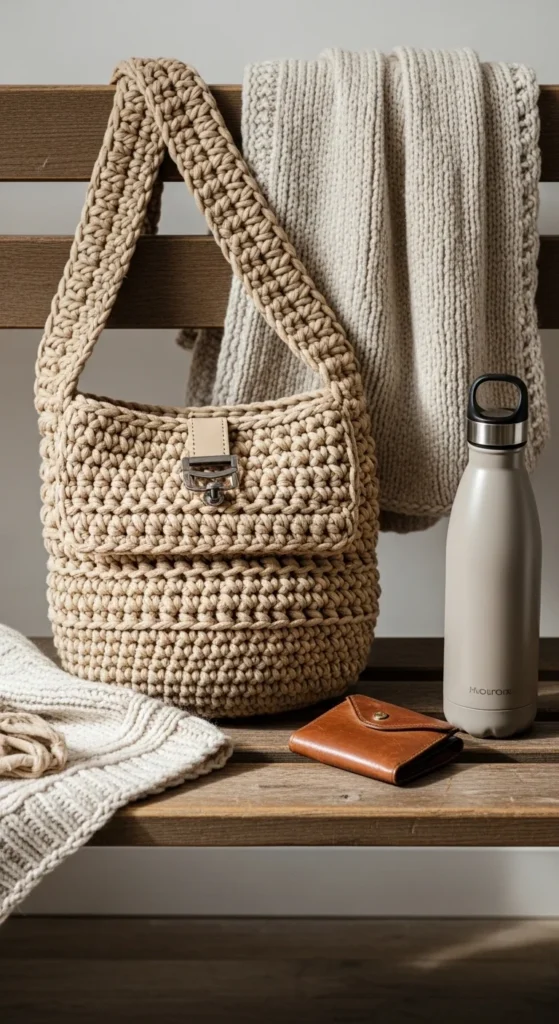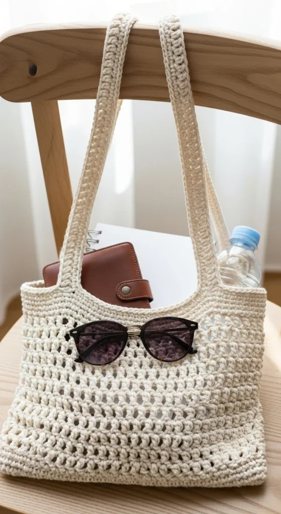 A beginner cotton everyday tote is one of the best places to start because it is simple, useful, and easy to pair with daily outfits. It can hold a notebook, wallet, phone, snacks, and a small bottle without feeling too bulky. Cotton yarn is a smart choice because it feels light, holds up well, and gives the bag a cleaner shape than very soft yarns. Stick to a basic rectangle or square base and long shoulder straps for easy use. Cream, beige, black, olive, and muted blue all work nicely for a bag you want to carry often. If you want to save money, skip fancy hardware and keep the design plain with neat stitches and strong handles. A fabric lining can help the tote last longer and keep small items from slipping through. This bag is practical, calm in style, and easy enough for someone making one of their first wearable crochet projects.