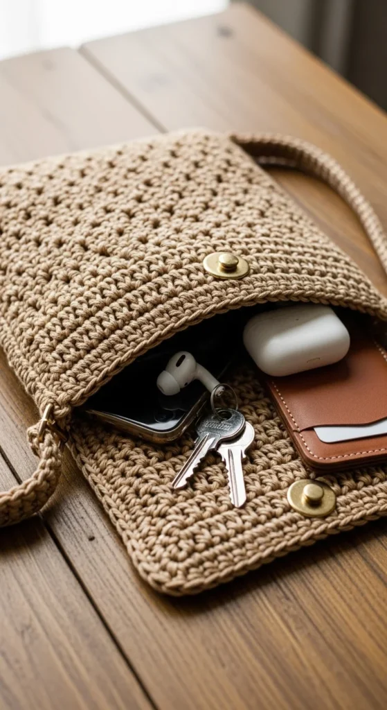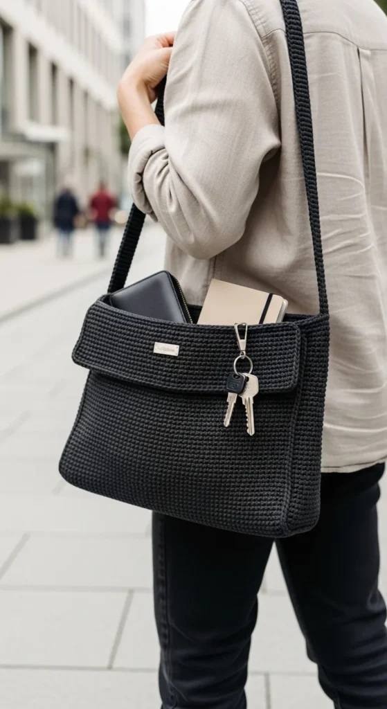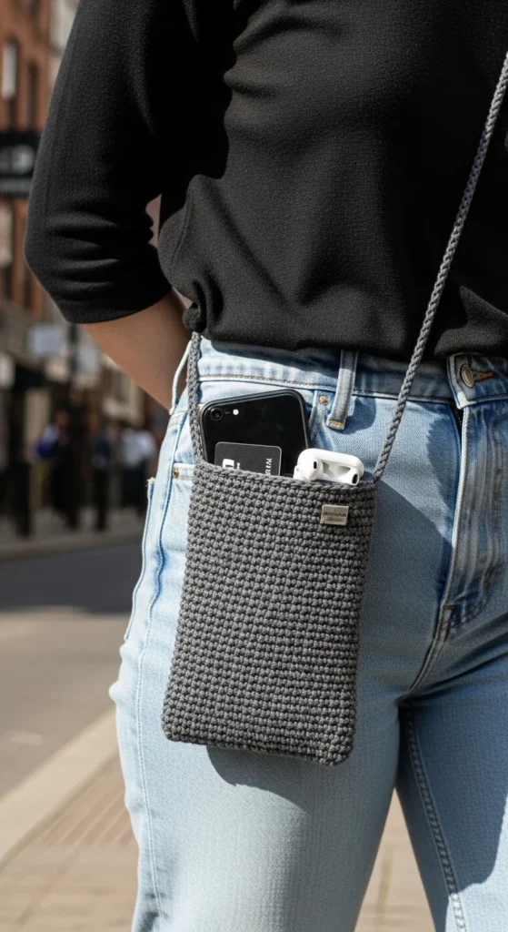 A tech-friendly phone sling bag is one of the most useful small crochet bag ideas for daily life. Many people no longer need a full handbag for short outings. A slim bag that holds a phone, cards, keys, and earbuds can be enough. This style is great for travel, walking, festivals, school runs, or quick store trips when you want hands free and a light carry. Cotton yarn is best because it stays comfortable and keeps the bag from feeling too heavy. A button flap, zipper, or snug top opening can help keep the phone secure. An outside pocket for cards or an inside loop for keys can make the bag even more practical. Charcoal, navy, cream, olive, and black are all easy everyday shades. This is also a good low-cost project because it does not require much yarn. It is compact, useful, and made for the way many people carry essentials now.