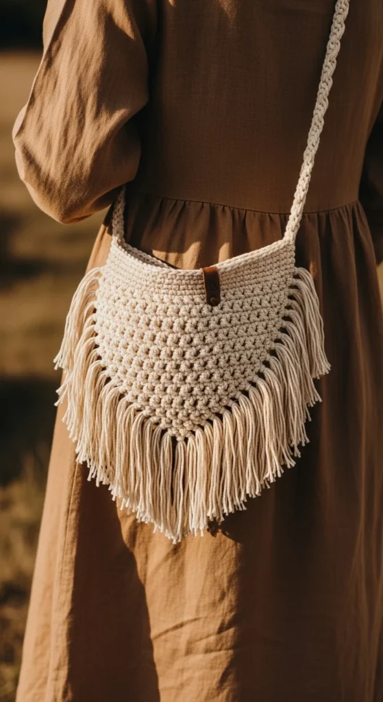 A boho fringe shoulder bag brings a relaxed handmade feel that works beautifully with casual outfits, summer layers, and everyday basics. The fringe adds movement and charm, while the roomy shoulder shape keeps the bag useful for actual daily carry. It can hold your wallet, phone, sunglasses, small notebook, and a few personal extras without trouble. Soft cotton yarn is a good pick because it lets the fringe drape nicely while still keeping the main body stable enough. Natural tones like cream, sand, camel, rust, and muted olive suit the boho look well. You can also add a wooden button or simple tie closure if you want a little security at the top. This bag does not need complicated shaping to look stylish. Often a good color, a soft silhouette, and clean fringe are enough. It feels relaxed, attractive, and especially nice for weekends, travel, casual dates, or everyday outfits with a laid-back feel.