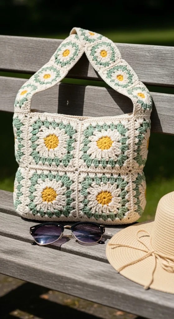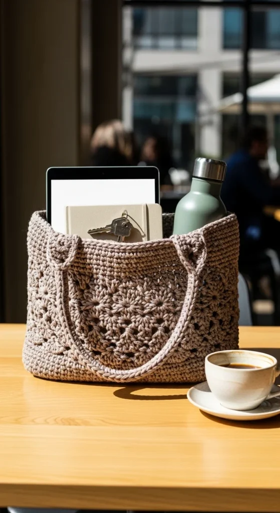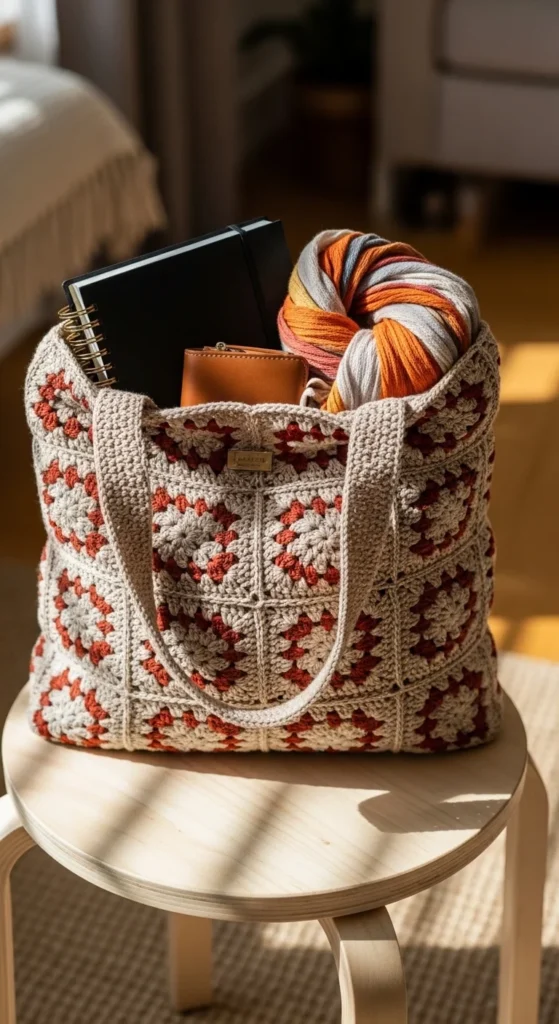 A granny square everyday tote proves that classic crochet can still feel current when the colors and shape are kept simple. Instead of bright rainbow squares, try muted shades like beige, rust, cream, olive, or dusty blue for a bag that feels easier to wear every day. This tote can carry books, groceries, small work items, or everyday extras while adding texture and color to plain outfits. A fabric lining can make the tote stronger and stop small items from slipping through gaps in the motifs. Long handles are best for shoulder carry, especially if the bag will hold heavier items. This is also a good stash-friendly project since granny squares can use many small amounts of yarn. If you enjoy portable crochet, making squares one by one can feel very manageable. The finished bag feels familiar but still stylish, and it works especially well for people who want something handmade with visible charm and real use.