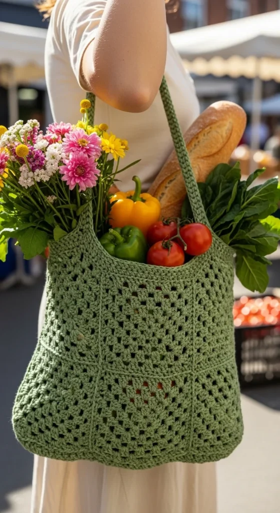 A solid granny market bag gives you the ease of a classic crochet style without the extra holes of a more open design. That makes it a good option for produce, everyday shopping, library books, or even a light cardigan and water bottle on the go. The solid granny construction is simple to build, which makes this a friendly option for beginners who want a larger bag without difficult shaping. Cotton yarn is the best match because it is breathable but strong enough for daily use. Sage, oatmeal, cream, navy, and warm brown all work well for a bag that feels casual and easy to pair with daily clothes. Make the straps a little wider if you plan to carry groceries. You can also add a top button if you want the bag to feel a little more secure. It is roomy, straightforward, and a strong choice for makers who want one crochet bag that can do many jobs.