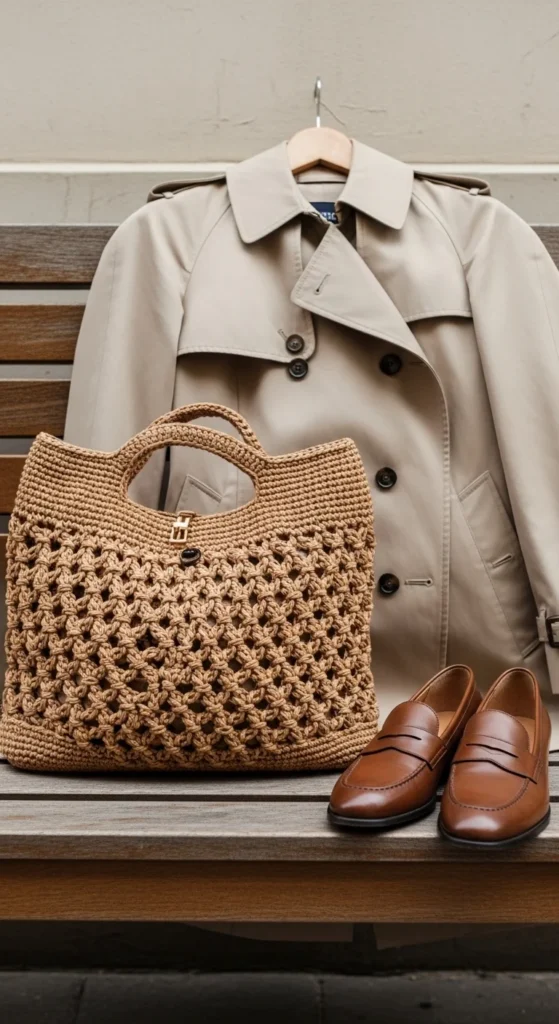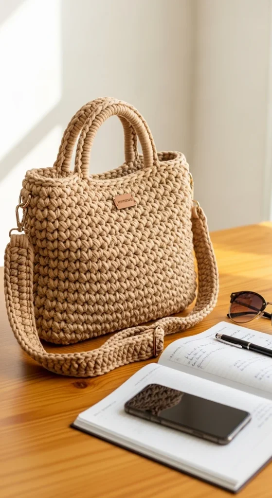 A neutral work-and-errand tote is ideal for people who want one bag that moves easily through the day. It can go from the car to a café, office desk, grocery stop, or quick shopping run without feeling out of place. A slightly structured shape helps the bag feel more polished, so use cotton, t-shirt yarn, or two strands held together. A wide flat base makes room for a tablet, notebook, wallet, makeup pouch, and a few extras. Neutral colors like taupe, charcoal, camel, black, and oatmeal give the bag a clean everyday look that works with many outfits. Keep the straps long enough for shoulder carry but not so long that the bag swings around too much. Add a simple inside pocket if you want a spot for keys or lip balm. This kind of crochet tote has real daily value because it looks stylish while still handling the practical side of busy routines.