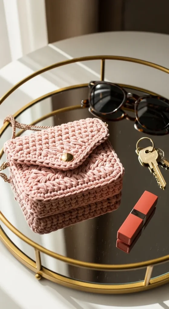 A herringbone mini purse is a great option when you want just enough room for your daily basics and nothing extra. It is small, stylish, and easy to grab for quick outings, coffee stops, evening walks, or casual dinners. The herringbone texture gives it a more refined look, which helps a simple mini bag feel special. A short strap or wrist loop works well, though a slim shoulder strap can make it even more useful. Try cotton yarn in blush, cream, black, camel, or dusty blue for a soft but polished finish. Since the bag is compact, it is a nice project for using small amounts of better yarn without spending too much. Add a zipper or button flap if you want more security. This bag is also a good gift project because most people can find a use for a small purse that holds phone, cards, keys, and lip balm. It feels tidy, stylish, and easy to wear.