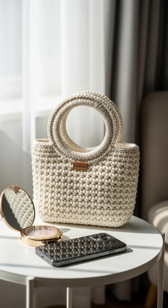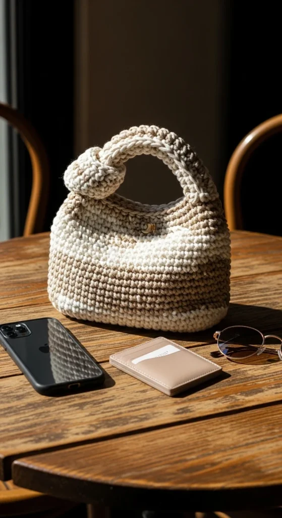 A mini knot bag is one of the simplest stylish bag ideas because the shape itself does most of the design work. It is compact, easy to carry, and ideal for short outings when you only need your phone, cards, keys, and maybe one or two personal items. The knot handle gives the bag a soft sculptural look that feels modern and a little playful. Cotton or t-shirt yarn both work well depending on whether you want the bag softer or firmer. Neutral shades are especially strong here because the shape stands out better when the color stays calm. This is also a smart quick project since the size is small and the design does not need much extra detail. You can keep it plain or add a contrast border if you want something subtle. It feels current, handmade, and easy to style with casual clothes, especially when you want a bag that looks interesting without needing much decoration.