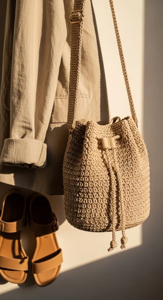 A drawstring bucket bag combines style and function in a way that works well for everyday life. The round or oval base gives it a roomy interior, while the drawstring top helps keep items in place. That makes it useful for errands, travel, shopping, or casual days out when you want a little more space than a mini purse can offer. Cotton yarn gives the bucket shape a good balance of softness and structure. Camel, beige, black, olive, and soft rust are beautiful colors for this style because they make the bag feel easy to wear often. You can keep the drawstring simple with crochet ties or add cord for a slightly firmer look. A long shoulder or crossbody strap makes it even more practical. This style has a relaxed but polished feel, and it works well for people who want something handmade that still feels fashionable and secure for everyday carry.