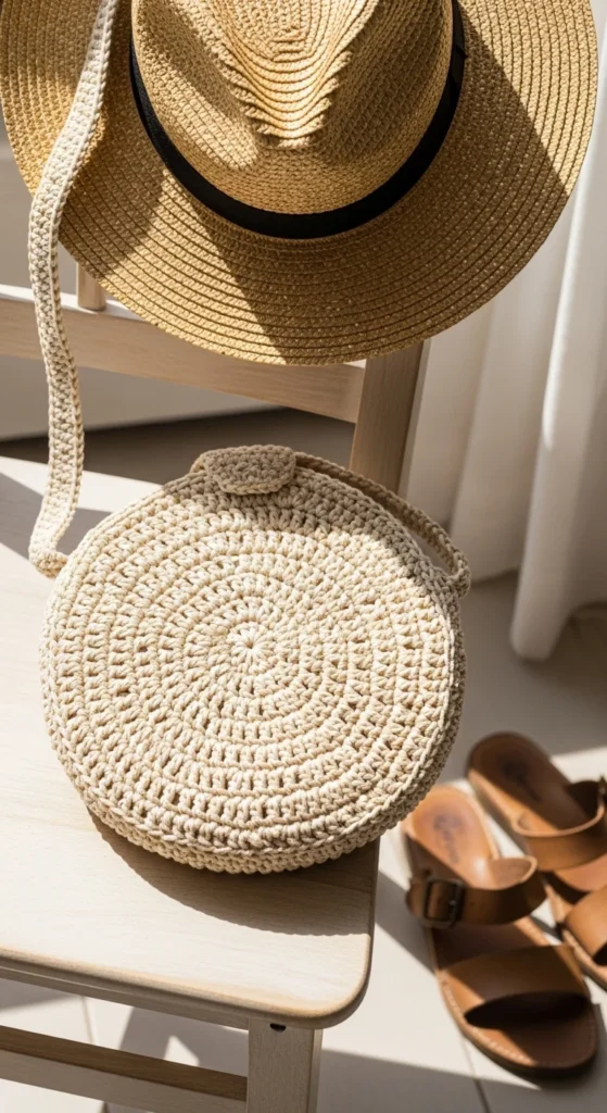 A round circle purse adds a different shape to your bag collection without giving up daily use. The circular body feels playful and stylish, but it still has enough room for the basics if you size it well. This type of bag looks especially good in natural cotton shades, soft tan, terracotta, cream, or muted mustard. It pairs nicely with simple outfits because the round shape becomes the main design feature. A slim shoulder strap or crossbody strap works best so the bag does not feel too heavy. Adding a fabric lining is a good idea, especially if the circle is made with open stitches or motifs. This bag is lovely for casual outings, vacation days, lunches, and warm weather walks, but it can also be used year-round in calmer tones. It feels handmade, charming, and a little different from the standard tote or rectangle, which is part of why it remains so appealing.