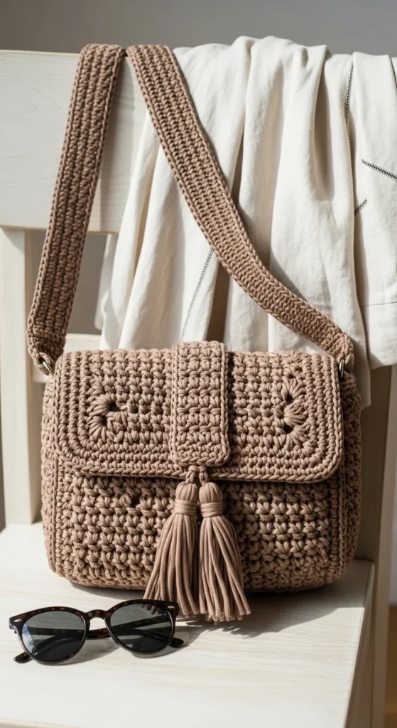 A tassel flap shoulder bag adds just enough detail to make a simple crochet bag feel dressier. The flap gives the bag structure and helps cover the opening, while the tassel adds movement and a little personality without much extra work. This style can hold everyday basics and still feel suitable for lunches, casual dinners, or day trips. Cotton yarn works well because the flap sits better and the overall bag feels lighter on the shoulder. Taupe, cream, soft brown, black, and muted clay are great shades here because they let the tassel stand out gently. You do not need a lot of embellishment beyond that one detail. A button or magnetic closure can keep the flap secure. This project is a nice option when you want something between very plain and very decorative. It feels easy to wear, polished enough for daily style, and still simple enough to stay practical.