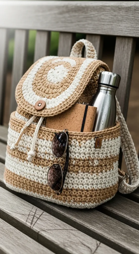 An everyday crochet backpack is a smart alternative for people who want hands-free comfort but need a little more room than a crossbody bag can offer. A compact backpack can hold a notebook, small bottle, wallet, keys, phone, and light extras while spreading weight better across the shoulders. That makes it useful for daily walks, classes, travel, or busy errands. A firmer yarn works best here because backpacks need more support than soft handbags. Cotton, t-shirt yarn, or doubled strands can all help. Neutral shades like cream, camel, olive, grey, or black keep the backpack easy to wear often. A flap and drawstring combo is a nice low-cost closure option. You can also line the body for more strength and shape. Crochet backpacks are less common than totes, which makes them stand out in a good way. They feel practical, a little unexpected, and very useful for people who want comfort with handmade style.