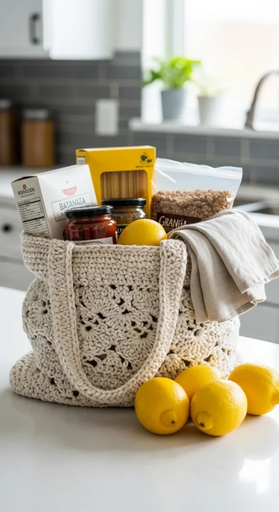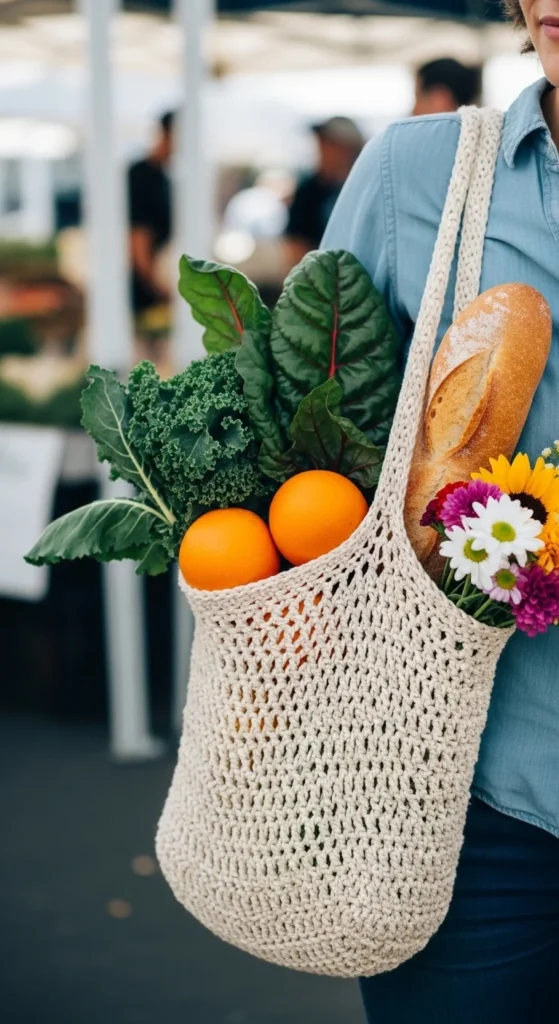 A cluster stitch grocery tote feels a little dressier than a plain market bag while still being practical for shopping trips. The texture gives the bag more body, which can help it keep a nicer shape when it is empty or half full. This makes it a good option for people who want a crochet tote that looks stylish enough for daily errands but still works hard. Cotton yarn gives the best balance of lightness and strength here. A sturdy base and medium-length handles can make the bag more comfortable when carrying heavier items. Soft neutral tones work beautifully, but stripes in earthy colors can also look great. If you want the bag to feel more secure, line the base or add a small button closure at the top. This project also feels satisfying because even simple yarn looks more special when the stitch texture stands out. It is practical enough for shopping and pretty enough to carry all week.