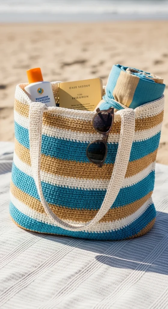 A striped beach tote brings together style and space in a way that makes summer outings easier. It can hold a towel, sunscreen, sunglasses, a book, snacks, and even a change of clothes without feeling too tight. This is where bold stripes really shine. Cream with blue, tan with white, or coral with sand can give the bag a sunny, relaxed look. Cotton yarn is still a strong choice because it is light and easy to shake out after use. Make the base wide and the handles sturdy so the tote sits well when packed. A small inside pocket for keys or cards is a nice addition and can save time when you are out. Even though it is designed with beach days in mind, this tote can also work for park trips, road travel, or carrying extra layers on casual weekends. It feels cheerful, roomy, and useful far beyond one season.
