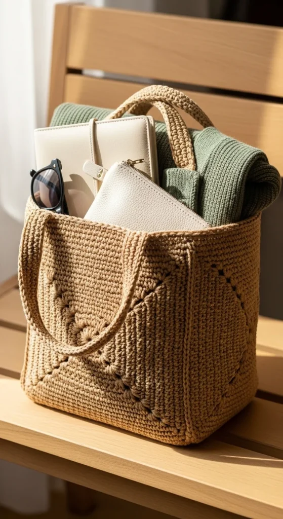 A structured square-base tote is a good answer for anyone who likes crochet bags but dislikes when they slump into a soft pile. The square base helps the bag stand up better, which makes it feel more like an everyday carry bag and less like a casual sack. This style is great for work supplies, books, small shopping trips, or even a light lunch and planner combo. Cotton yarn, t-shirt yarn, or doubled strands can all help with firmness. You can also add a fabric lining or a sewn base insert for extra shape. Neutral shades make this bag easy to wear daily, but a contrast handle or top border can add subtle style. Keep the body simple so the shape does most of the work. This type of bag is especially nice for people who want a handmade look with a cleaner finish. It is tidy, useful, and one of the most wearable tote styles on the list.