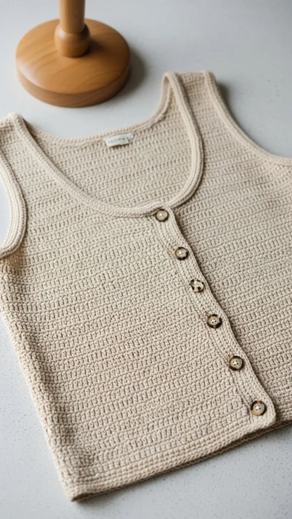 A button-front tank feels structured without being complicated. Use a firm stitch like half-double crochet. Add small wood or pearl buttons for detail. This top pairs well with skirts, shorts, or denim.