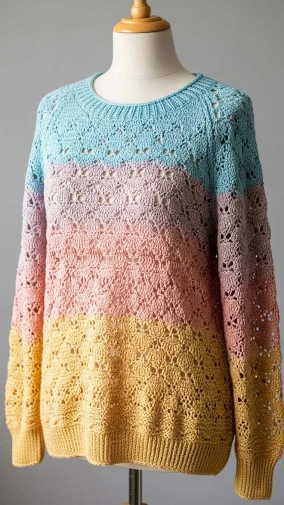 Use two or three colors to create a smooth fade. Change colors gradually. Keep the stitching simple so the colors stand out. This sweater looks modern and polished.